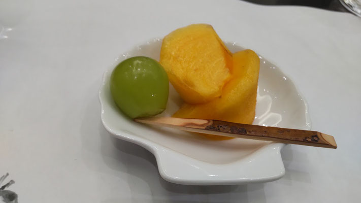 締めの果物、柿とマスカットは、秋の余韻を楽しく口に運んだ。