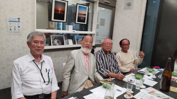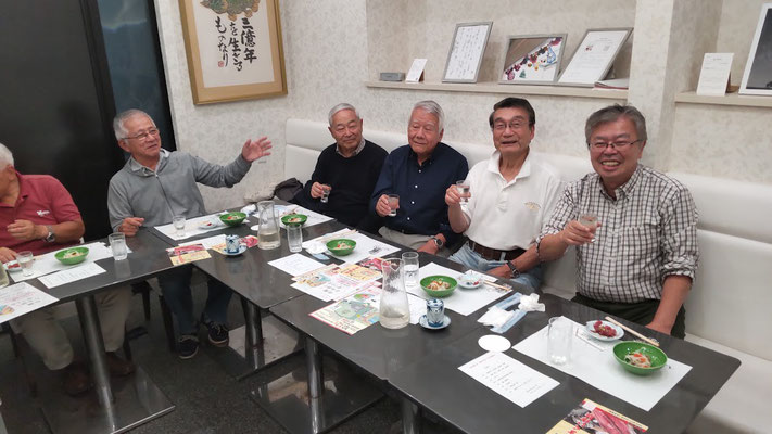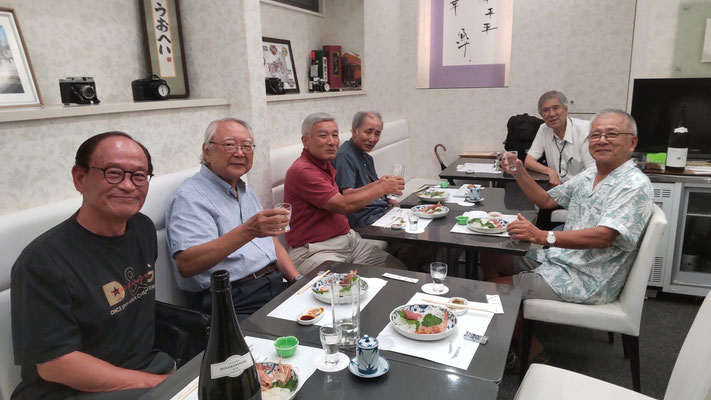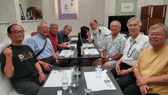 真夏の逗子に涼を求めて集った10名。会場はお馴染み「うおへい」。今宵の銘酒は、奈良・上田酒造の「嬉長(きちょう)」と、じっくり2日かけて凍らせた「味蔵冷酒」。髙山惠太郎(S41政経)氏より、飛鳥時代に百済から渡来した酒の技術者「酒司(さけのつかさ)」の話が披露され、古の酒造りに思いを馳せた。
