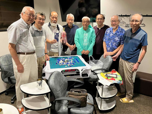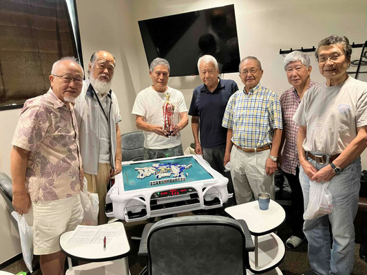 今回は、藤沢稲門会から田中雄一さん(写真でペパーミントグリーンの服を着ている方)が2回目の参加。田中さん以外にも、強豪の雀士が集まったが、そんな中で、髙山惠太郎さんが悲願の初優勝を果たした!
